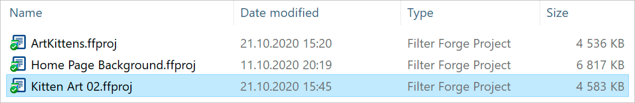 - You can save projects to project files (.ffproj), which are fully self-contained documents. They store everything that your artboards depend on – dimensions, filters, images, and settings.