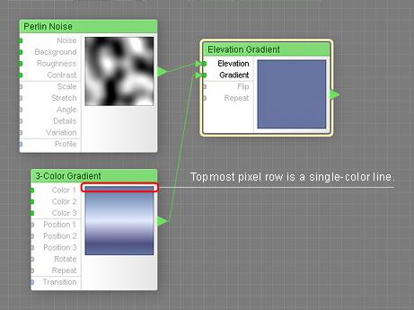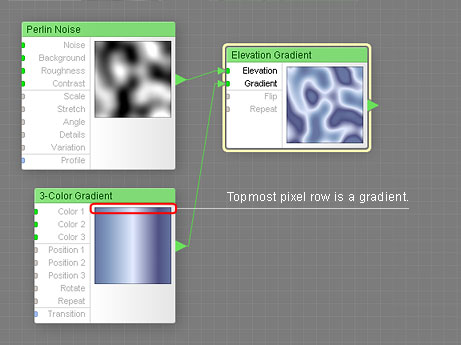 When a map component is connected to the Gradient input of the Elevation Gradient component, only the topmost pixel row of the image supplied by this input is sampled as a gradient. In a horizontally-oriented gradient, the topmost row of pixels is a gradient, so the result is a correctly colored elevation gradient: