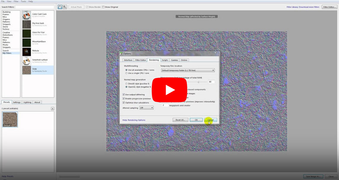 Download filters, use and change them. Explore some of the possibilities like render maps and seamless tiling.