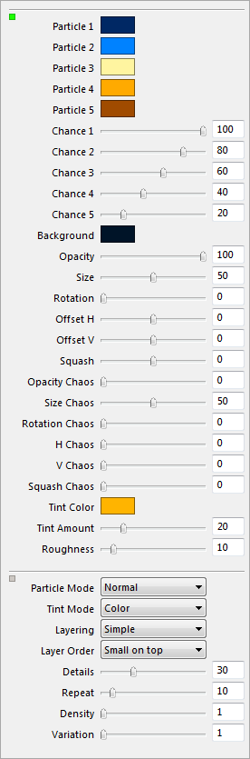 Every aspect of particle placement is under your control: you can specify size, rotation, opacity, stretch/squash, horizontal and vertical offsets as numbers, or you can "map" them with another image: