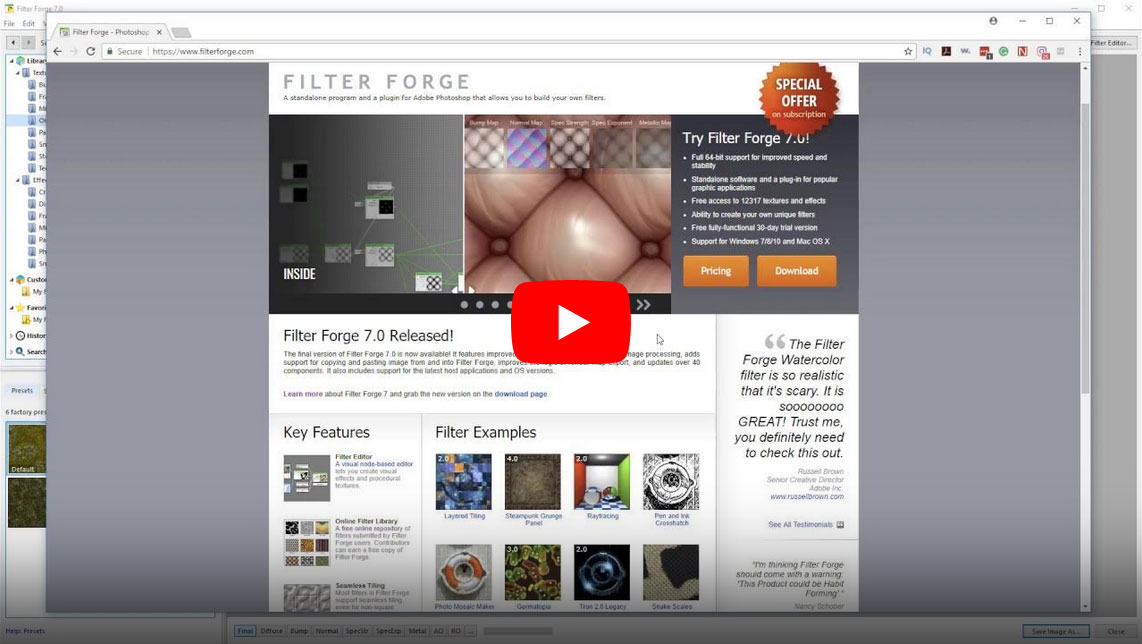 Meet Filter Forge’s interface, create a new file and set custom resolution. Work with textures, use presets, settings, lighting tabs. Have a look at some effects and frames in action.