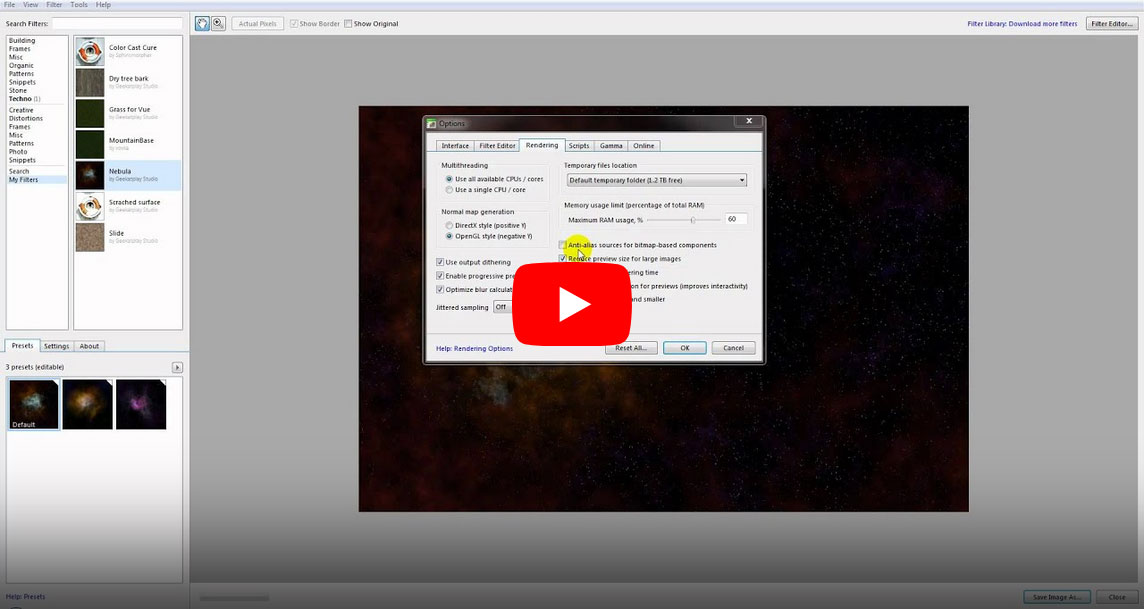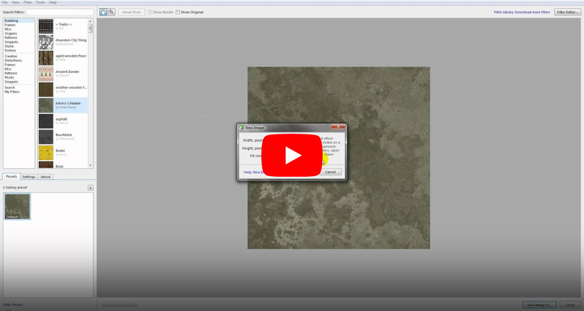 Download and install Filter Forge as a plugin into Paintshop Pro. Find Filter Forge in the Effects tabs and get acquainted with Filter Forge main features.