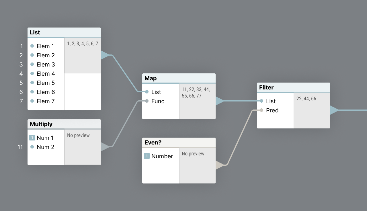 Ultraforge fully supports higher-order functions, that is, functions that take other functions as arguments or return other functions. This allows Ultraforge to have nodes such as Map, Filter, and Fold — the cornerstones of functional programming. A Map node applies a provided function to a list of elements, while a Filter node removes elements from a list that don't satisfy criteria provided by a function. In the example above, a Map node multiplies all elements of a list by 11, then a Filter node removes all non-even numbers from the list.