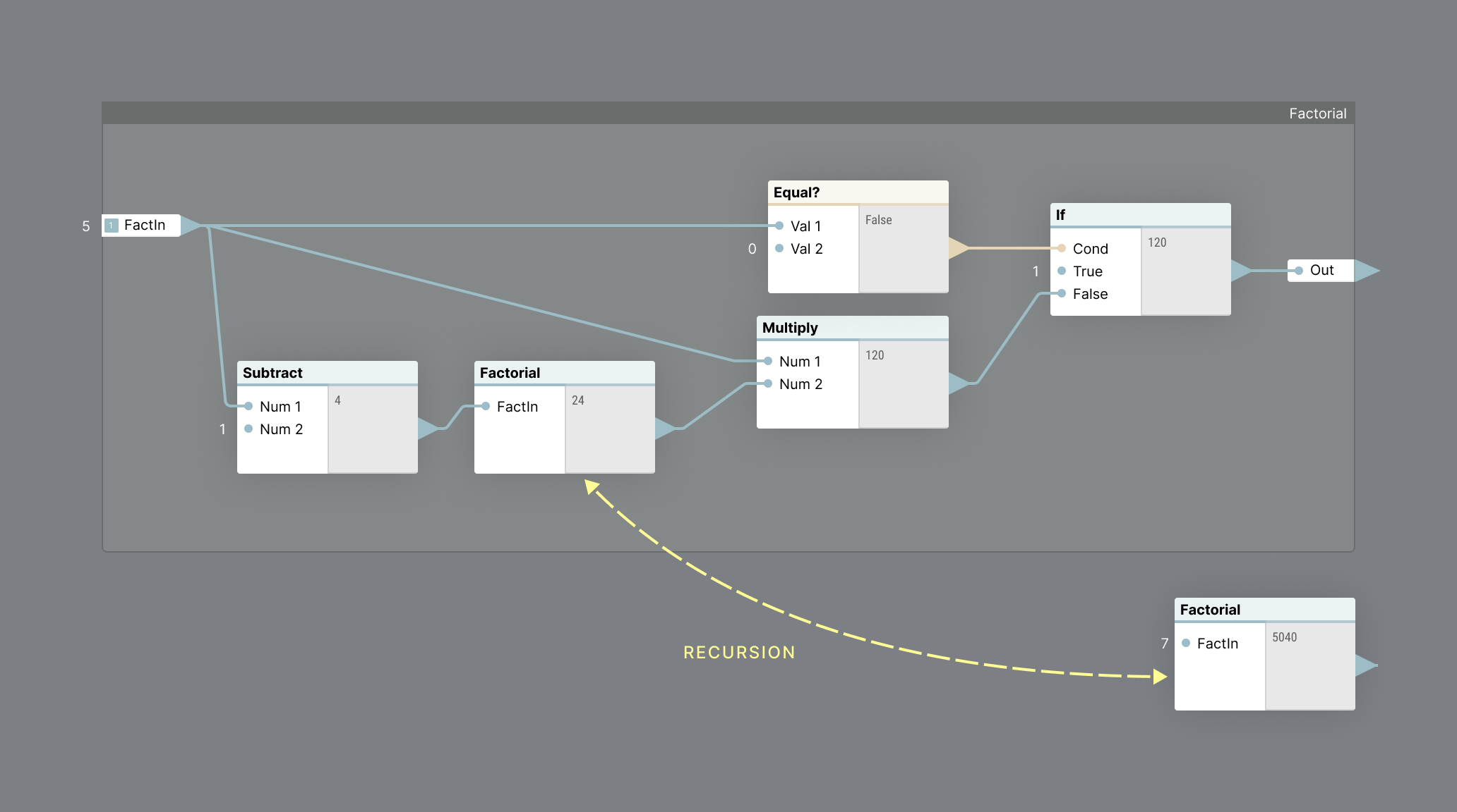 Ultraforge supports recursion, which means that custom functions can call themselves. Recursion serves as a basis for many, many algorithms — and now you can implement these algorithms directly in Ultraforge, in a fully visual way. The picture above shows a recursive Factorial function.